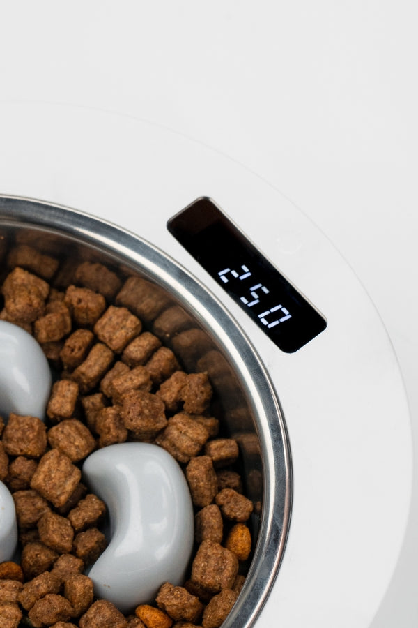 Med den indbygget digitalvægt i hundeskålen, kan du nemt aflæse den præcise mængde hundefoder, din hund har behov for til spisetid.